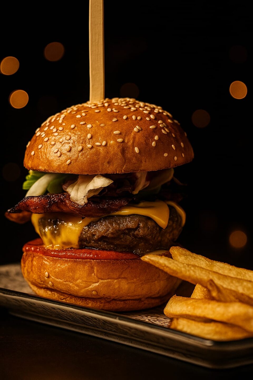 €12.00Hamburger di manzo**, cheddar, cipolla caramellata, bacon croccante, insalata, pomodoro, cetriolino sottaceto e ketchup al pomodoro secco home-made