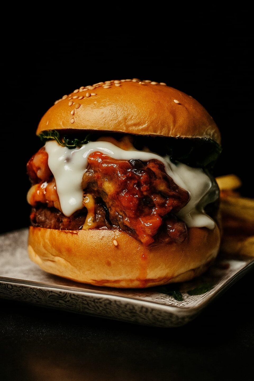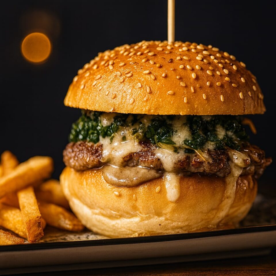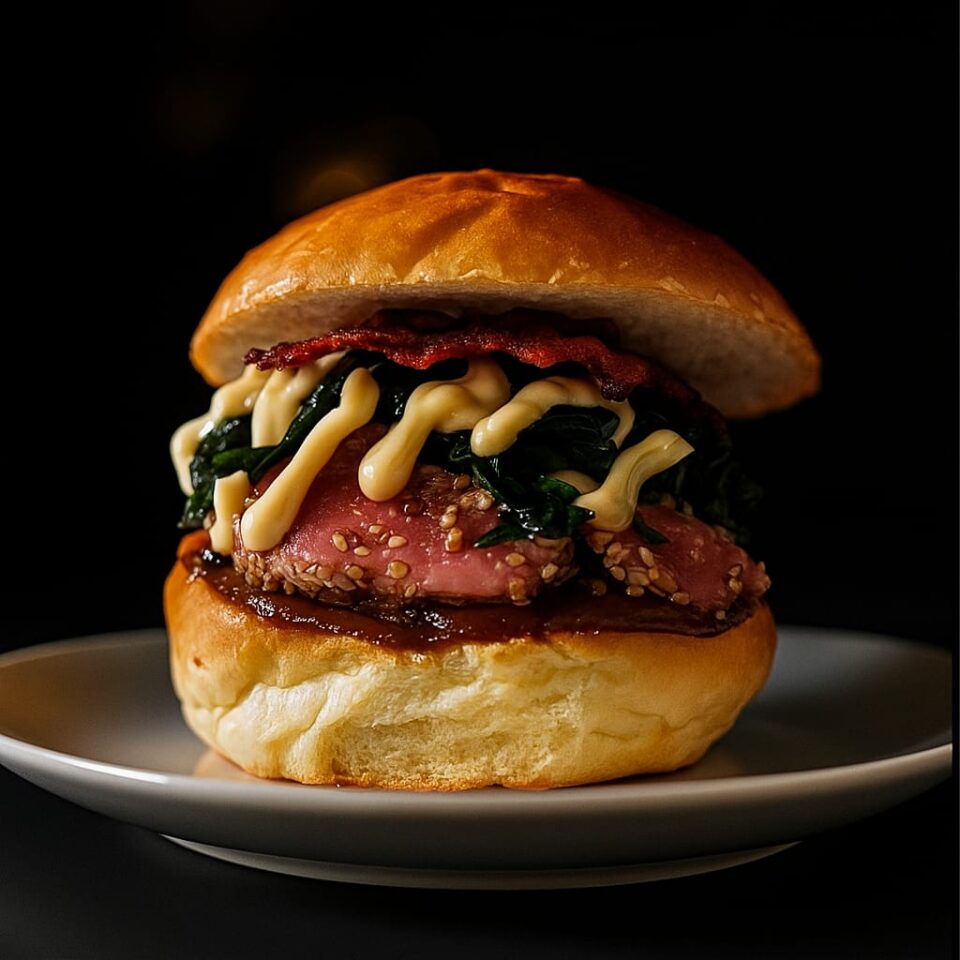 €14.00Hamburger di Maiale,spinaci saltati al burro con uvetta e pinoli,crema al grana e Mayo all'aglio nero