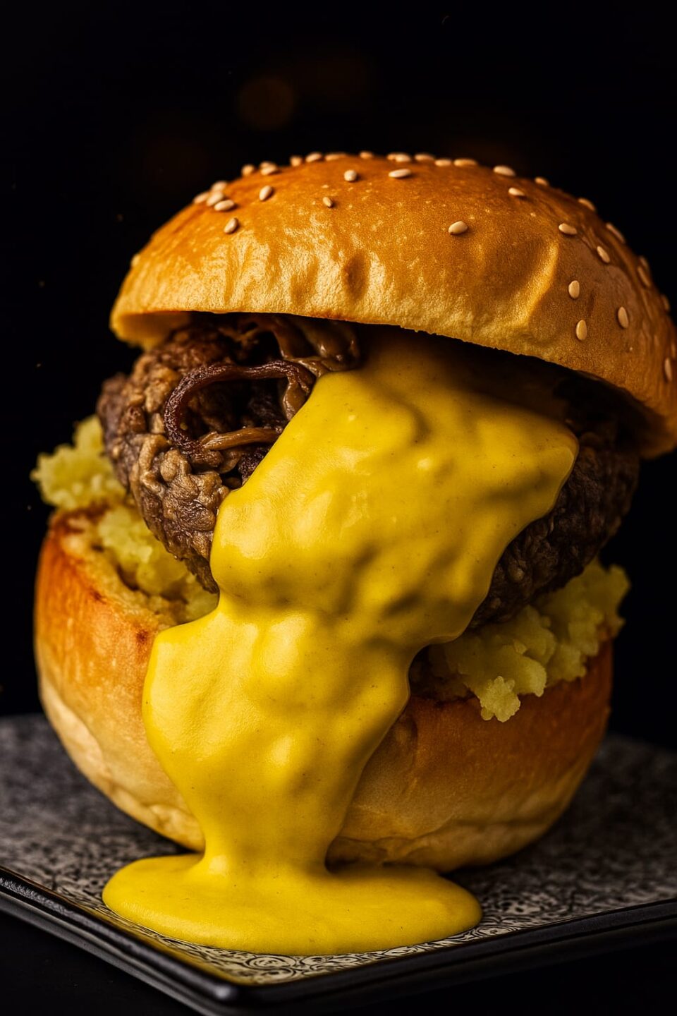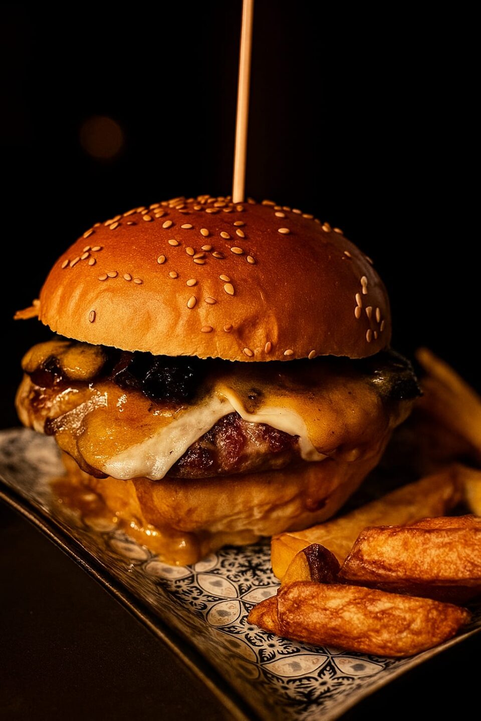 €14.00Hamburger di pecora home-made** (carne, pomodoro secco, rosmarino, timo, finocchietto selvatico), patata rustica in verde alla base, funghi trifolati e crema di pecorino al curry