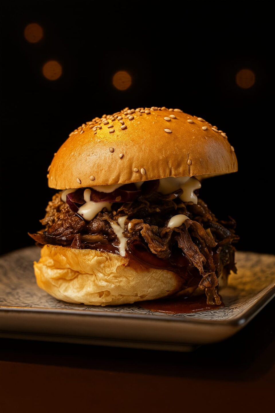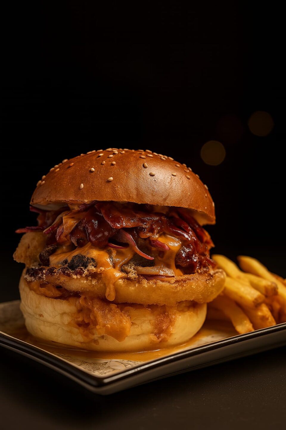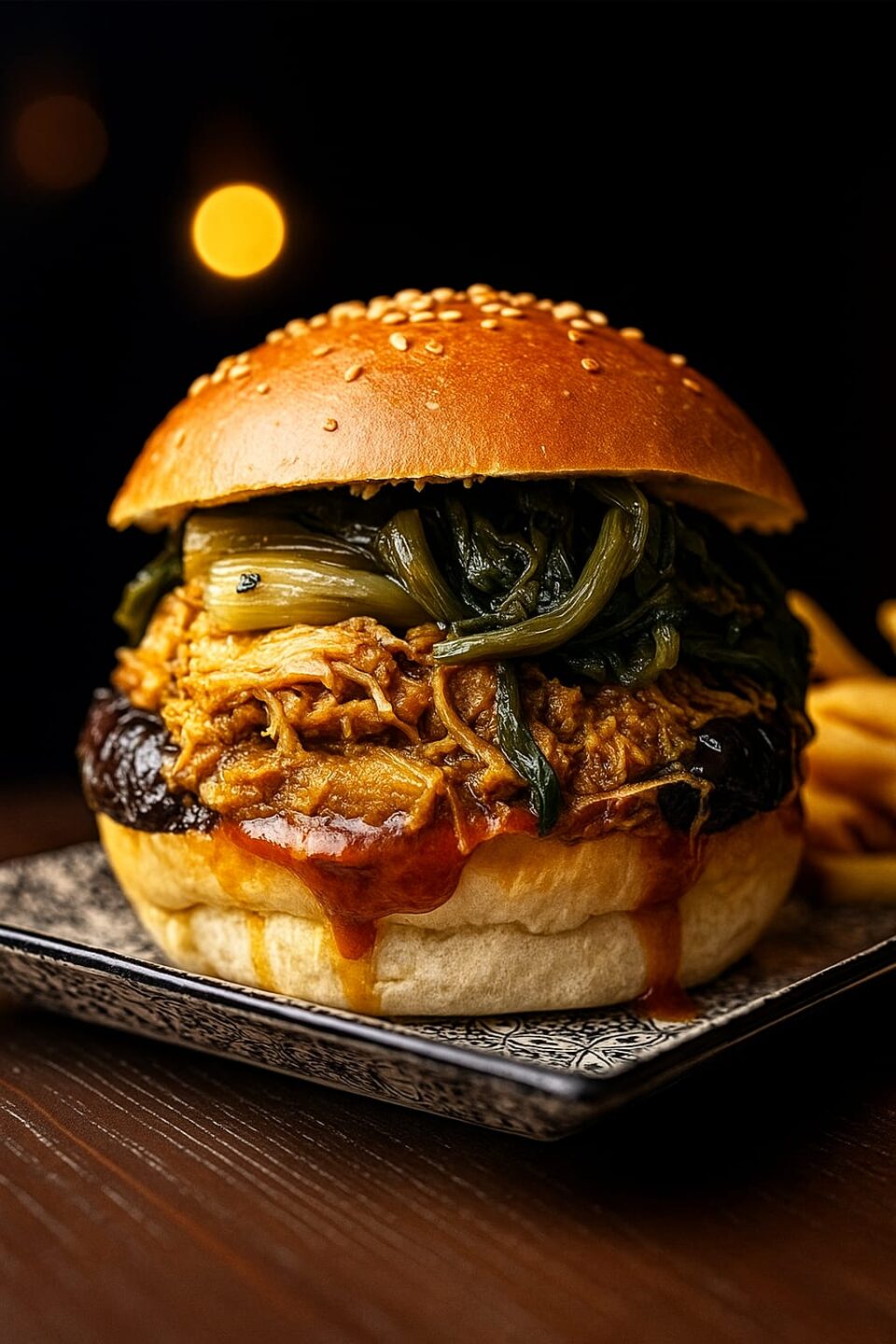 €15.00Oriental BBQ(soia e zenzero), Petto d'anatra in crosta di sesamo, Coleslaw di cavolo nero e petali di mandorle, maionese all'arancia e bacon fritto.