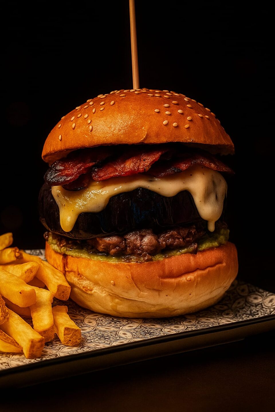€14.00Hamburger di manzo**, melanzana fritta, pecorino fresco, bacon, cipolla caramellata e guacamole.
