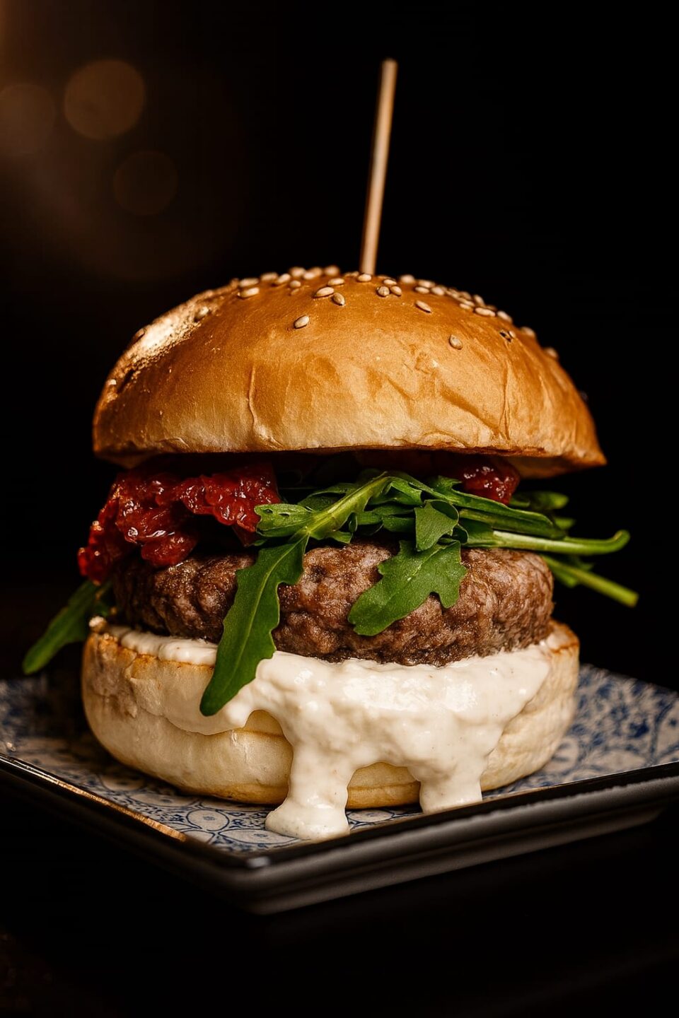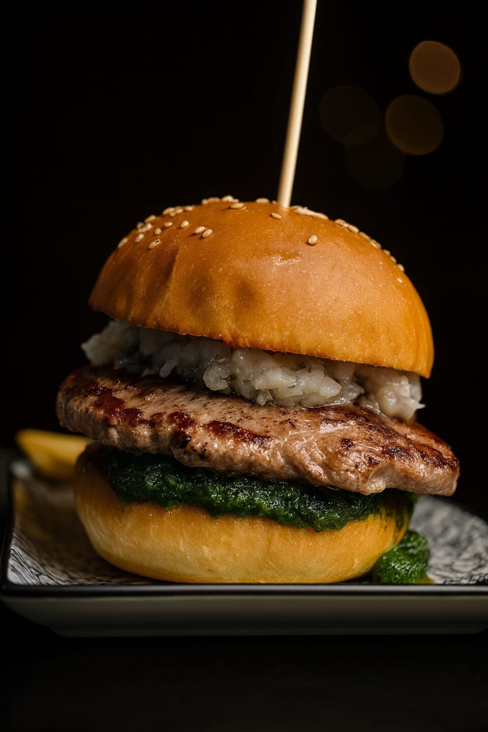 €14.00Hamburger di manzo,pesto di cavolo nero, battuta di lardo e noci caramellate